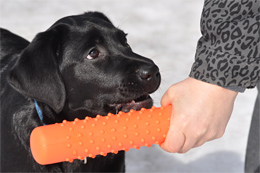 Norppa lähtee kyllä hakemaan esinettä, mutta palautuksissa on paljon petrattavaa: esine jää usein joko matkalle tai pentu ei malttaisi luopua siitä. Olemme harjoitelleet sekä heitetyn esineen että muutaman metrin päässä maassa olevan esineen noutamista. En alkuun tajunnut vaatia odottamaan paikallaan käskyä noutaa, mutta nyt työstämme palautusten ohella odottamista.