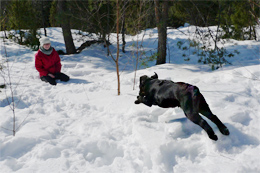 Sisällä Norppa osaa kierähtää moitteetta vasemman kylkensä kautta ympäri. Ulkona kierähtäminen vaatii vielä hienoisen käsimerkin avuksi. Huomasin tätä merkintää tehdessäni, että unohdin yhden Norpan taitaman käskyn: Se osaa mennä pyydettäessään kyljelleen. Ehkäpä tästä on vielä joskus apua hoitotoimenpiteitä tehdessä.