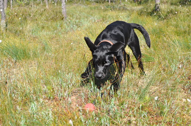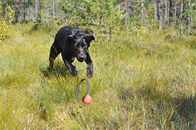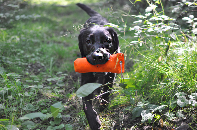 Luoksetulon ohella ohjelmassa on ollut runsaasti noutoja. Norpalla ei ole ollut oikein mielenkiintoa tuoda damia minulle, joten olemme keskittyneet palautuksiin. Yritin aikani saada koiraa damin kanssa luokseni kutsumalla, innostamalla, juoksemalla vastakkaiseen suuntaan ja piiloutumalla pensaiden taakse – kaikilla tuloksetta. Norppa vain tuijotti minua dami suussaan tai tiputti sen niille sijoilleen ja ryntäsi luokseni tyhjin suin.